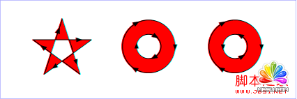 3. 稍微復(fù)雜一點(diǎn)的是fill-rule屬性。這個屬性定義了判斷點(diǎn)是不是屬于填充范圍的算法;除了inherit這個值外,還有兩個取值: evenodd:這個值采用的算法是:從需要判定的點(diǎn)向任意方向發(fā)射線,然后計算圖形與線段交點(diǎn)的個數(shù),個數(shù)為奇數(shù)則改點(diǎn)在圖形內(nèi),需要填充;個數(shù)為偶數(shù)則點(diǎn)在圖形外,不需要填充。看下圖的示例: