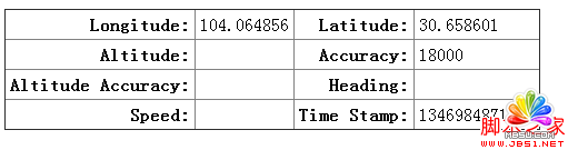 返回的position對(duì)象包含兩個(gè)屬性,coords:返回坐標(biāo)信息;timestamp:獲取坐標(biāo)信息的時(shí)間。其中coords又包括下面屬性:latitude:緯度;longitude:經(jīng)度;altitude:高度;accuracy:精確度(米);altitudeAccuracy:高度精確度(米);heading:行進(jìn)方向;speed:行進(jìn)速度(米/秒)。