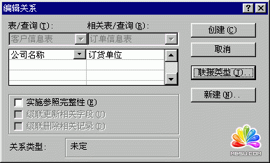 這個對話框可以幫助我們編輯所建立的關系,通過左面的列表框可以改變建立關系的兩個字段的來源。可以單擊“新建...”按鈕創建新的關系,或者單擊“聯接類型”為聯接選擇一種聯接類型。單擊“聯接類型”按鈕,在彈出的新對話框中選擇第三項,然后單擊“確定”按鈕就可以了。回到“編輯關系”對話框后單擊“創建”按鈕。