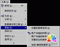 首先將鼠標移動到主菜單上的工具按鈕上,然后單擊鼠標左鍵,會彈出一個子菜單,將鼠標移動到這個菜單上的安全選項上,會在這個選項右面彈出一個菜單,將鼠標移動到這個菜單上的“用戶與組權限”上,單擊鼠標左鍵,這樣會在屏幕上彈出一個對話框,