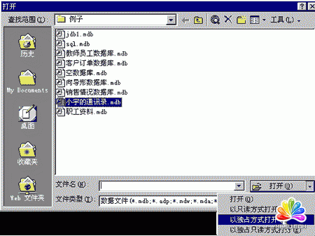 在這個對話框中選擇需要打開的數據庫,然后將鼠標移動到這個對話框中“打開”按鈕右面的向下按鈕。在彈出的菜單中選擇“以獨占方式打開”,并單擊這個選項。