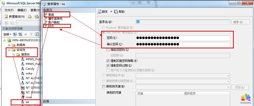 (3:展開“安全性”->“登錄名”->“sa”,右鍵選擇“屬性” ,然后左側(cè)選擇“常規(guī)”,右側(cè)選擇“SQL Server 身份驗證”,并設(shè)置密碼;選擇“狀態(tài)”,選中“啟用”,點擊“確定”
