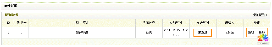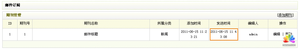 此時就可以在新增的分類下面成功發表訂閱期刊了(如圖24)?梢钥吹狡诳腎D、期刊號、期刊名稱、所屬分類、添加時間、發送時間、編輯人信息。選擇“編輯”鏈接可對期刊進行編輯,選擇“刪除”鏈接刪除當前期刊,期刊一經刪除不可再恢復(如圖25)。再次新增期刊與編輯期刊的方法與新增期刊一樣。