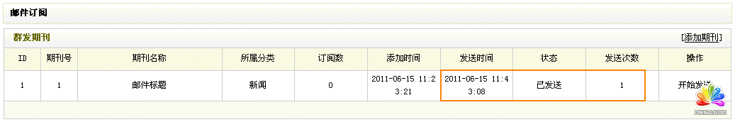 從上圖24可以看到,發送時間為未發送。新增的期刊可以通過“模塊/群發期刊管理”將新增的期刊批量發送給郵件訂閱的用戶(如圖26)。選擇“開始發送鏈接”發送郵件(如圖27)。郵件發送成功,訂閱期刊管理中的發送時間變為發送時間(如圖27)。群發期刊管理中的狀態變為發送時間(如圖29)。
