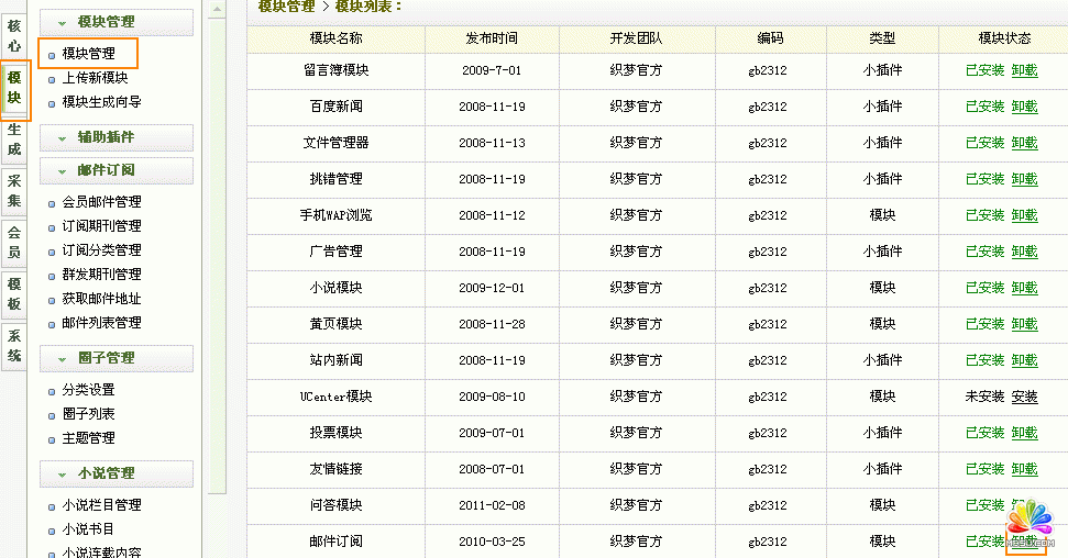 郵件訂閱模塊卸載:進入“模塊/模塊管理”,找到郵件訂閱,選擇“卸載”鏈接即卸載了當前模塊(如圖30)。左邊的郵件訂閱菜單消失。