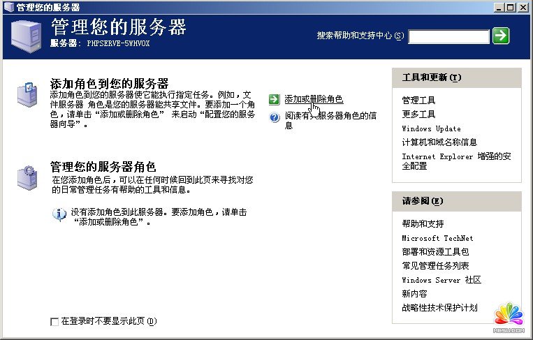 打開“開始”菜單,點擊“管理您的服務器”(如圖1所示),點擊“添加或刪除角色”(如圖2所示)。