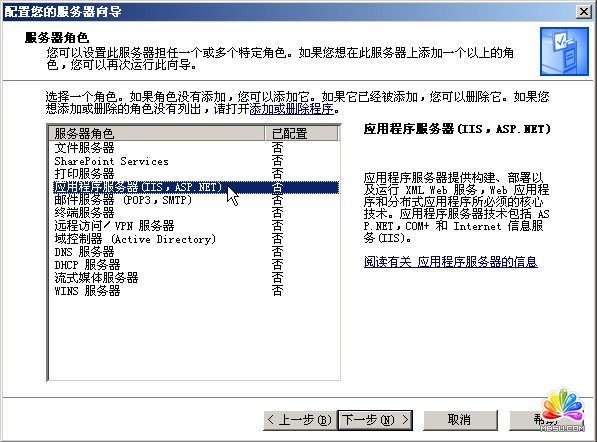 進入預備步驟后直接點下一步。到達了選擇角色的地方,選擇“應用程序服務(IIS,ASP.net)”(如圖3所示)