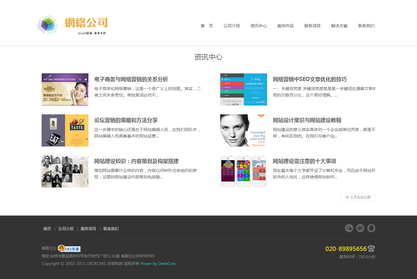 織夢最新內核開發的HTML5網絡公司企業網站模板,打開超炫,假一罰十,DEDE5.5內核以上都可以使用;附帶測試數據;兼容手機。
