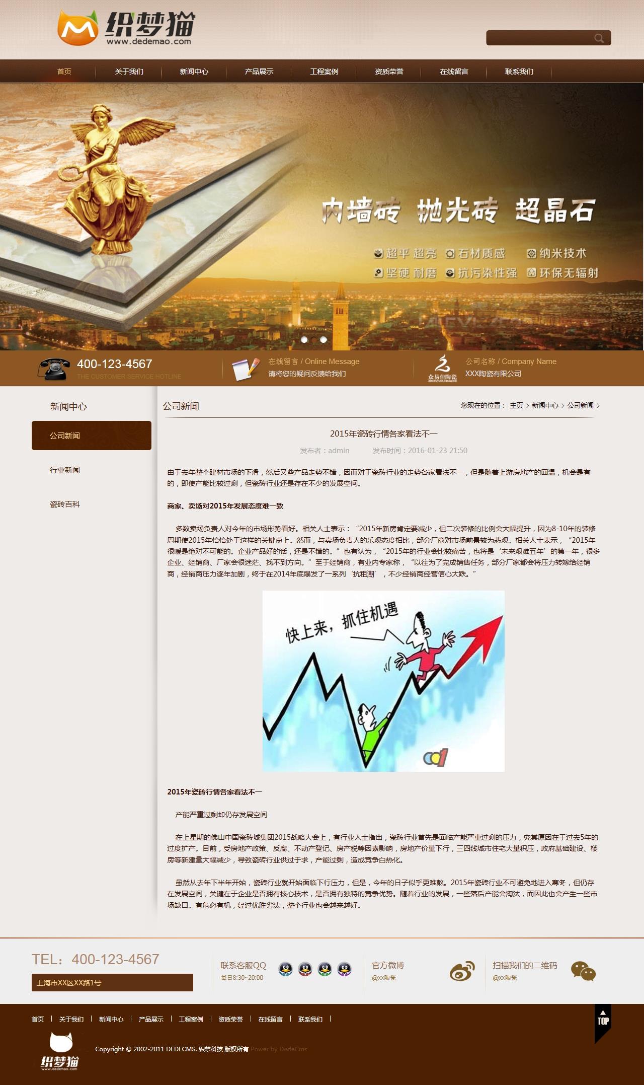 棕色陶瓷類企業通用織夢模板(帶手機版),測試完整無錯,兼容主流瀏覽器。