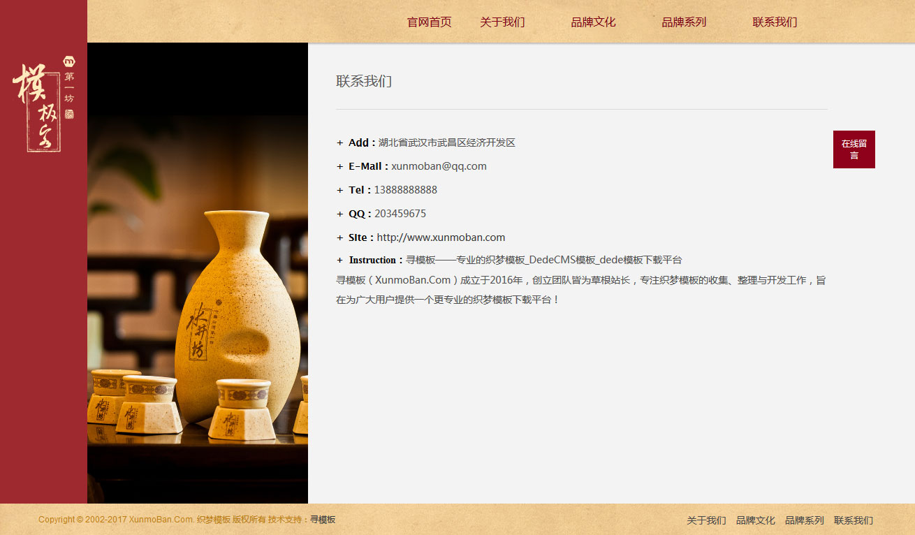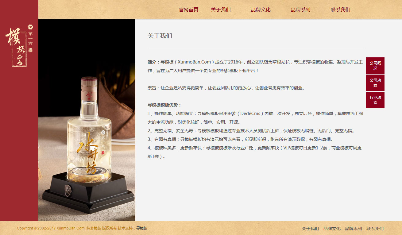 這是一款適合高端白酒品牌企業的織夢模板,高端奢華,簡潔大氣,白酒品牌企業不二之選。全站寬屏設計、代碼干凈,欄目清晰明了,用戶體驗很好。
