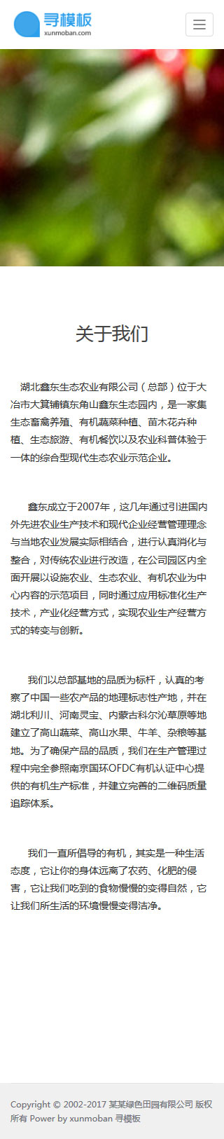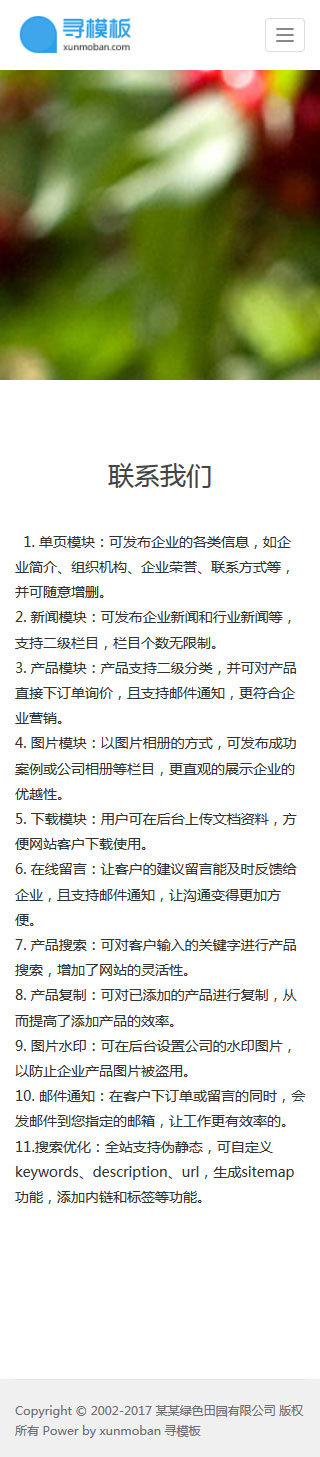 綠色果蔬田園農(nóng)業(yè)響應(yīng)式織夢網(wǎng)站模板是一套設(shè)計簡約大氣優(yōu)雅精致的企業(yè)類網(wǎng)站模板。此套模板設(shè)計優(yōu)雅大氣,干凈簡潔,給人很舒服的感覺。整站配色以綠色為主,綠色給人的感覺就是清爽,也符合模板的設(shè)計風(fēng)格。看多了藍色風(fēng)格的模板,這樣一套綠色風(fēng)格的模板讓人感覺特別的小清新。模板部分細節(jié)的效果也是不錯的,例如列表頁的頂部banner圖片有動態(tài)展示效果。手機端的頁面效果也是很不錯的,同樣的簡潔大氣。不過頁面整體來說可能有點太過簡單了,如果可以在加強一些細節(jié)的設(shè)計就更好了。