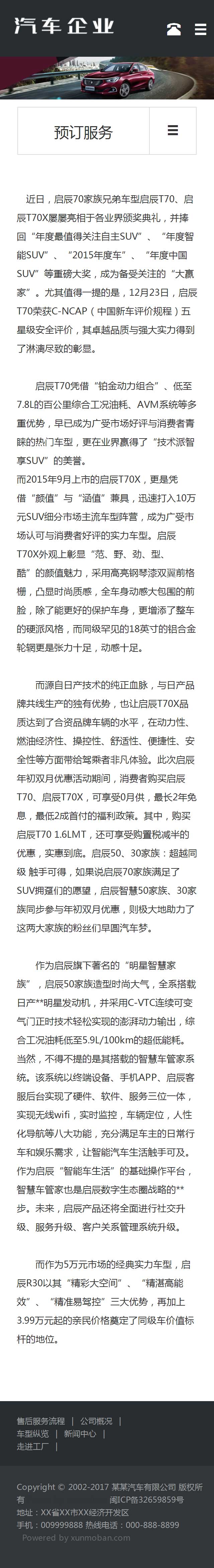 響應式汽車銷售展示服務類織夢模板,該模板大氣整潔,頁面布局豐富,顏色配色非常的炫酷,非常符合汽車類行業的企業使用,手機端采用自適應布局,無需單獨管理,使用方便!