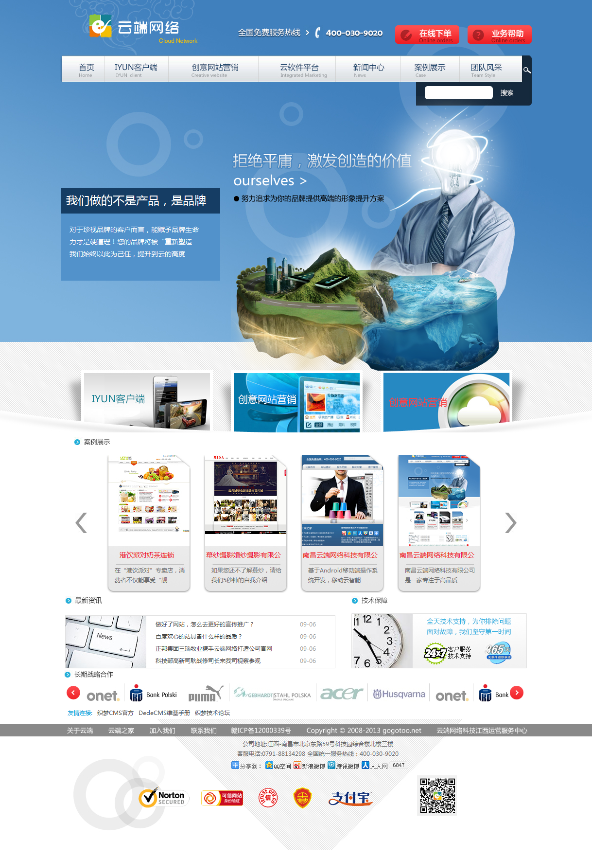 本織夢(mèng)模板適合網(wǎng)絡(luò)公司和個(gè)人工作室等企業(yè)使用模板,華麗大氣的藍(lán)色配色,整站超級(jí)大氣,簡(jiǎn)單而不奢侈。基于DEDECMS5.7 UTF-8設(shè)計(jì),模板可以自由導(dǎo)入導(dǎo)出。如果是GBK請(qǐng)自行轉(zhuǎn)換編碼,或者讓我們協(xié)助。