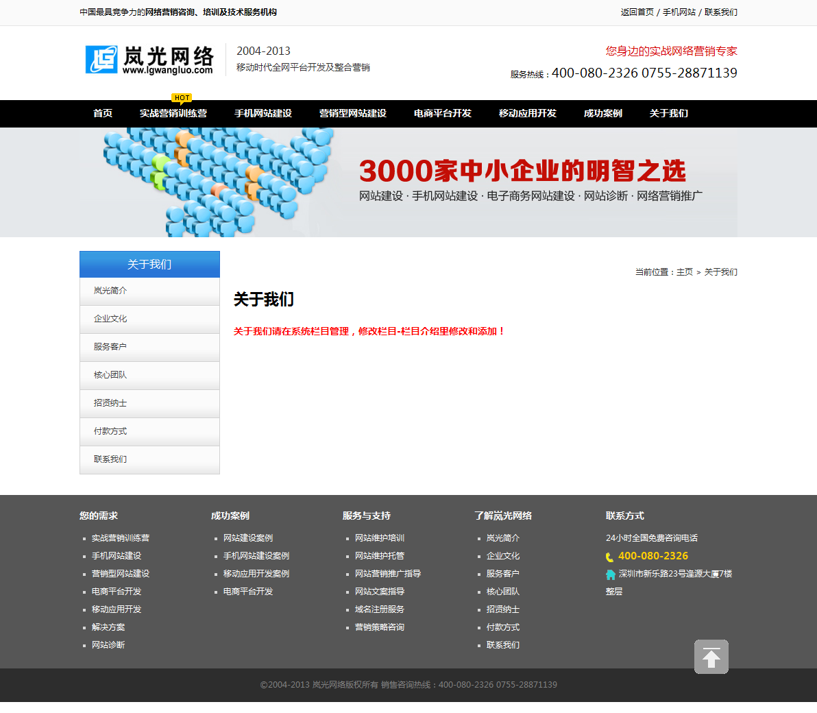 1.關于我們,公司簡介,企業文化,聯系方式 三個欄目的內容請在欄目管理-欄目內容處修改