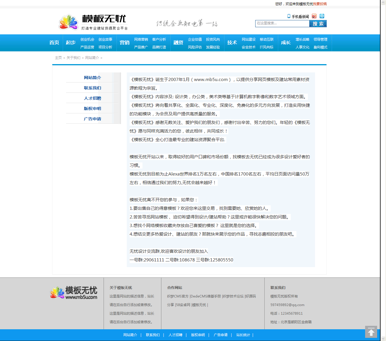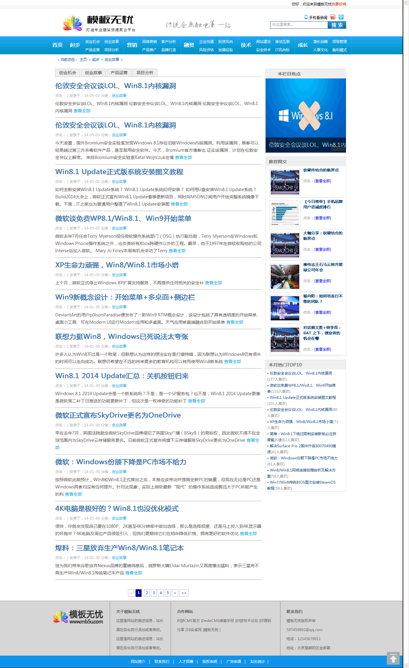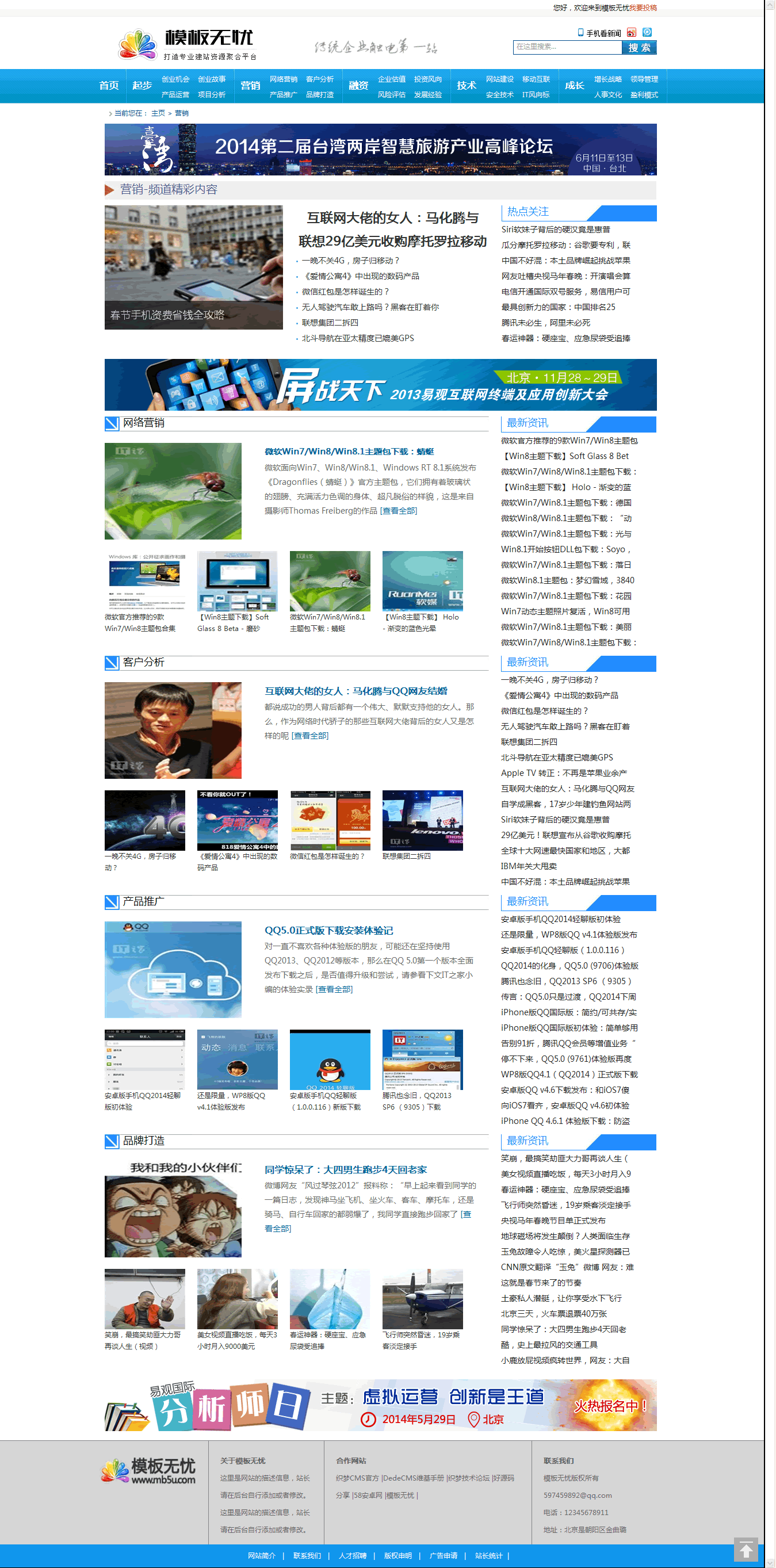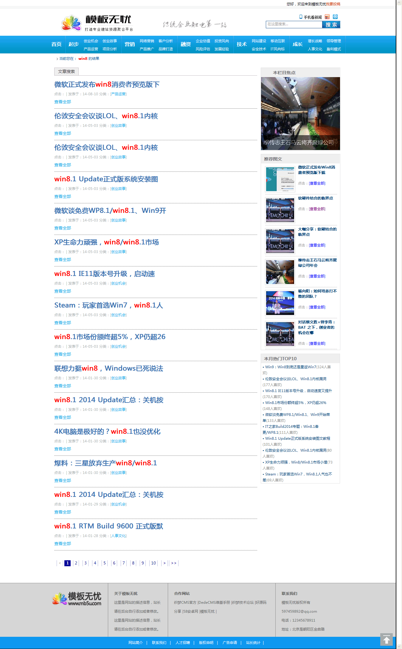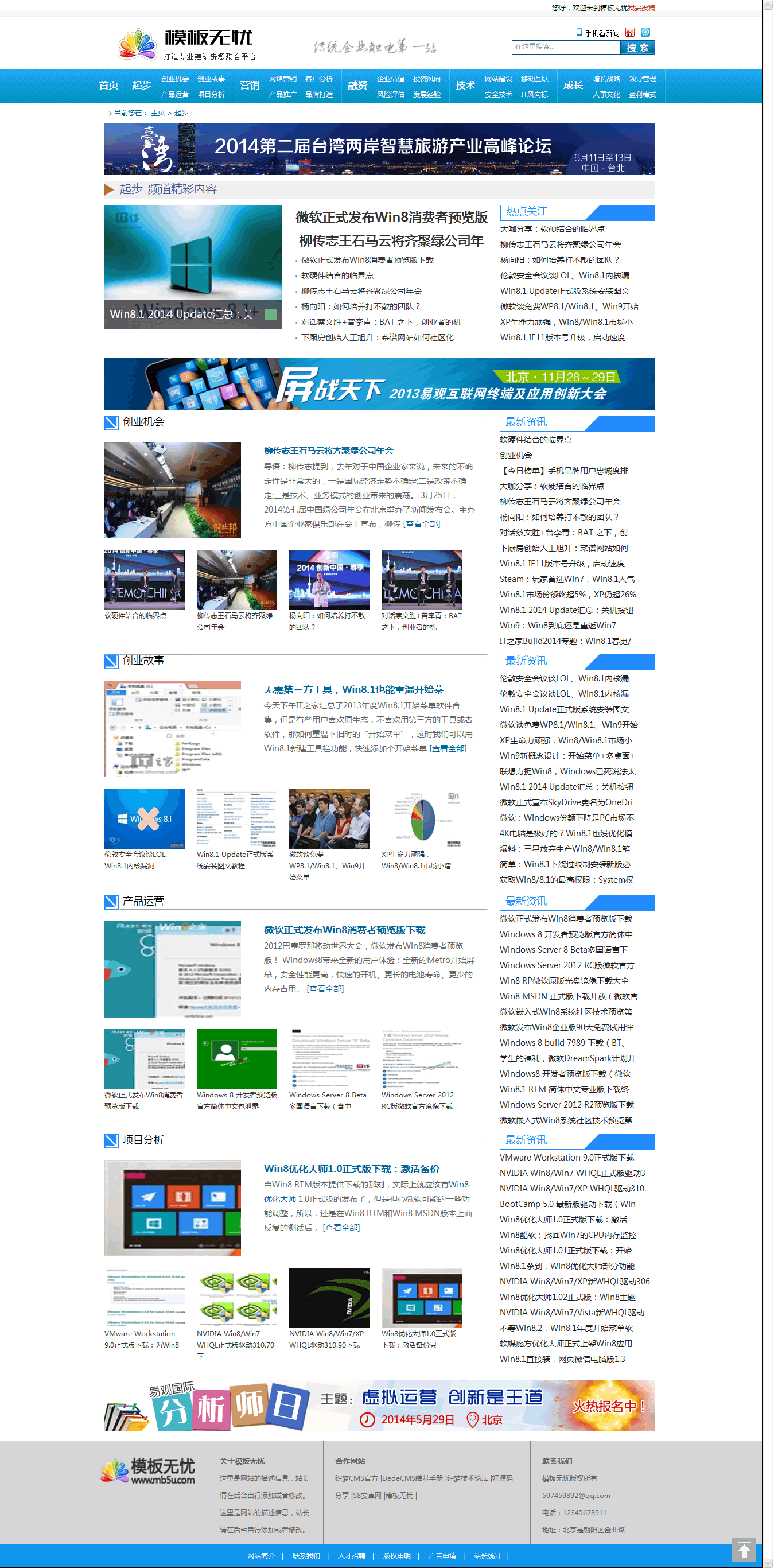 dedecms內(nèi)核開發(fā)的藍(lán)色通用新聞資訊門戶,包括的頻道比較多,主要頻道包括起點(diǎn)頻道,技術(shù)頻道,融資頻道,創(chuàng)業(yè)頻道,營(yíng)銷頻道,成長(zhǎng)頻道等。非常適合文章資訊類,學(xué)習(xí)教程類,新聞門戶類,可以說(shuō)通用。只需要簡(jiǎn)單改一下欄目名稱就可快速搭建。根據(jù)自己的網(wǎng)站建設(shè)需求,快速建站。