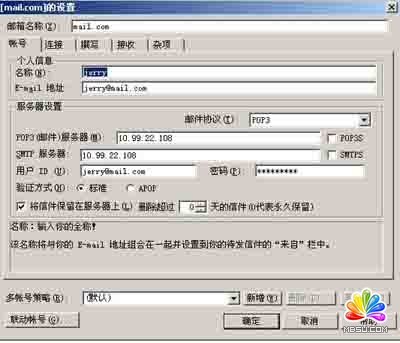 我用的是Becky、SMTP和POP3設(shè)置如下,ID我填的是jerry@mail.com,是因為我在POP3服務(wù)建立account的時候,有一個提示框提示,截圖如下: