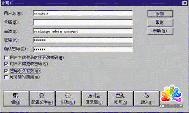 1.在Windows NT域用戶管理器中建立一個Exchange Server管理賬號,比如名為"exadmin"。注意,一定要將此賬號添加到"Administrators"組中。如圖1所示。