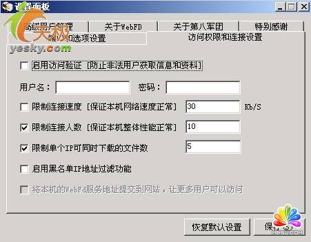 點(diǎn)擊“控制面板”按鈕進(jìn)入圖13的界面,選中“端口和選項(xiàng)設(shè)置”標(biāo)簽項(xiàng),勾選“每次都以后臺(tái)方式運(yùn)行在系統(tǒng)托盤(pán)區(qū)”、“每次開(kāi)機(jī)自動(dòng)運(yùn)行本程序”等復(fù)選框。而“服務(wù)端口”數(shù)值會(huì)出現(xiàn)在網(wǎng)站的地址中,你可以選擇系統(tǒng)默認(rèn);在“訪問(wèn)權(quán)限和連接設(shè)置”標(biāo)簽項(xiàng)(圖14)中設(shè)置“限制的連接速度”、“限制的連接人數(shù)”和“單個(gè)IP限制下載的文件數(shù)”等選項(xiàng);在“高級(jí)用戶(hù)管理”標(biāo)簽項(xiàng)(圖15)中設(shè)置“綠色通道用戶(hù)IP地址”和“最大連接數(shù)”,我是在本地機(jī)上建立自己的FTP 網(wǎng)站的,所以我在“綠色通道用戶(hù)IP地址”欄中輸入我的IP地址192.168.0.2,在“最大連接數(shù)”欄中輸入訪問(wèn)我的FTP網(wǎng)站的計(jì)算機(jī)數(shù)量為30臺(tái)。