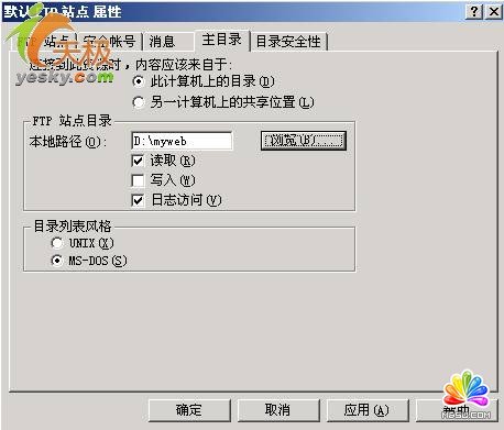 (3)設(shè)置“主目錄”標(biāo)簽項(xiàng):在“本地路徑”框中點(diǎn)擊“瀏覽”按鈕選擇目標(biāo)目錄“D:\myweb”(如圖3)。