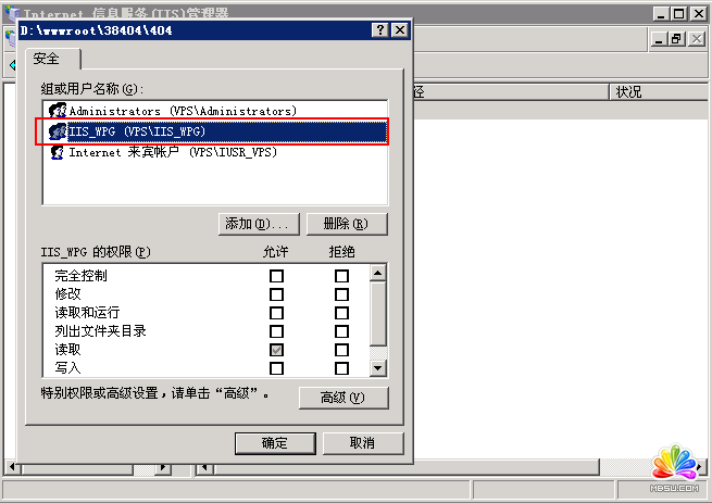 服務器或者VPS是有權限配置的,而且權限配置很嚴密。首先查看一下404.html的安全屬性,404頁面的“安全”選項卡里“組或用戶名稱”中并沒有IIS相關的用戶組,看來是IIS本身沒有權限訪問這個文件了。也就是漏掉一個工作組權限了,那就是IIS_WPG。因此直接給這個站點下面的404.html加上IIS_WPG組讀取和運行權限就可以了。再次測試就成功了!