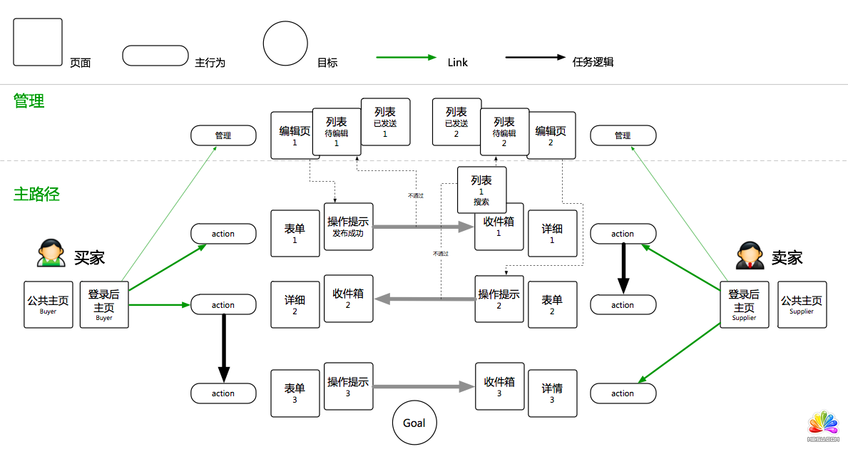 對應上圖的純用戶行為視角,再稍微細化一下,把他轉化為產品的用戶行為流程圖,把抽象的信息結構化。比如,上圖中報價只是一個箭頭表示信息流買家,而實際的網站行為中,報價需要買家主動去查看。所以該行為被結構化成一個標準網站行為術語“查看”。整體著眼,我們可以觀察到不同用戶的目標,行為,產生的信息,以及之間的關聯和流向。