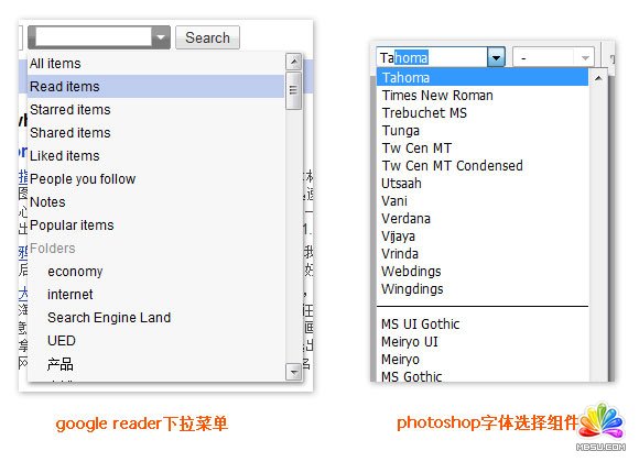 Google reader這樣的帶輸入操作的下拉菜單,讓下拉菜單更加易用。(這種控件組合在word、photoshop等軟件里很常見,如字體選擇控件)