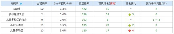 首先一個網(wǎng)站關(guān)鍵詞的選取是由多方面決定的:百度指數(shù)是其一,它決定了關(guān)鍵詞競爭的激烈程度,對那些競爭激烈的關(guān)鍵詞,我們要先放放,由多動癥這個專題的關(guān)鍵詞來看,它的幾個關(guān)鍵詞的百度指數(shù)比較高,競爭相對激烈,能做到現(xiàn)在這個位置也算不錯的了,當然這也依托于39健康網(wǎng)這個強大的平臺。