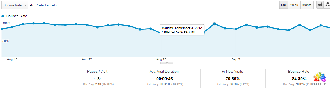 從8月15日至8月22日:由于大量原創文章,讓搜索引擎給予了持續的權重,這一期間,從搜索引擎來的流量開始逐漸增大。但是一個很明顯的問題產生了:在這一時期,網站的跳出率非常高,幾乎達到了90%,也就是說,搜索引擎雖然帶來了很多流量,但是訪問者幾乎沒怎么看網站的內容。他們在網站上停留的時間平均為30秒。