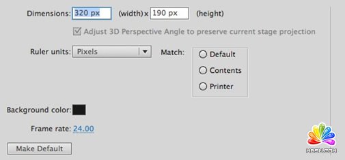 打開Flash創建一個新文檔,舞臺大小設為320*190,顏色為#181818 ,幀頻為 24fps.