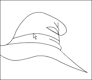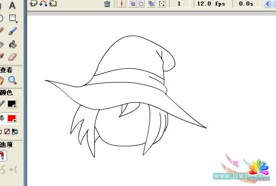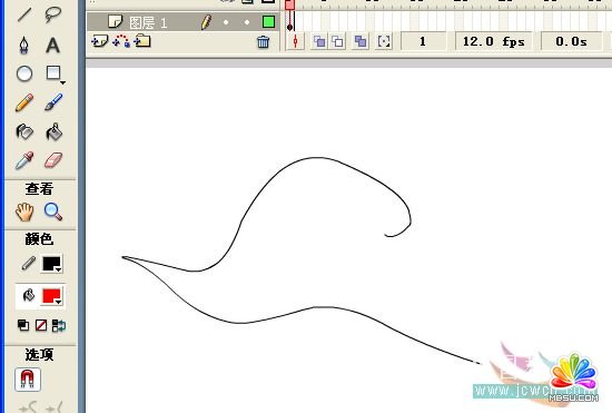 打開Flash,新建一個空白的Flash文檔。首先來畫帽子~選擇線條工具,先在場景中畫一條橫直線,然后用選擇工具把它變成曲線(這個變曲線的方法在葉子的繪制里有說了,不明白的就去看下吧~)