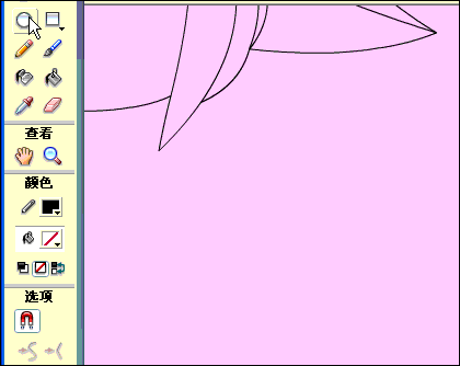 我在前面一個教程里已經說過了,放大是畫畫不可缺少的,像我們下面要畫的眼睛吧,因為眼睛雖大,但以百分百的場景來畫,還是不順手的,所以選把場景變大吧~放大到百分之二百,或者更大,看個人習慣了。選擇橢圓工具,把填充色關掉,點下面的那一紅色斜線的按鈕就行了,然后在場景中畫出一個橢圓,用選擇工具改變好形狀。如圖: