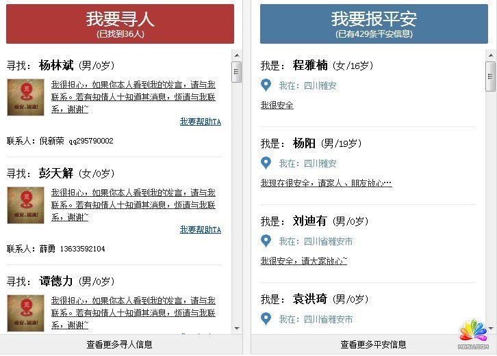 最新數據顯示,百度貼吧尋人平臺目前已成功找到了36人。此外為了讓更多的力量參與并擴散貼吧尋人平臺,百度除整合貼吧、搜狗、360、一淘及微博等尋人數據外,百度貼吧還推出“雅安地震尋人數據庫”,并呼吁媒體及站長共同救難。