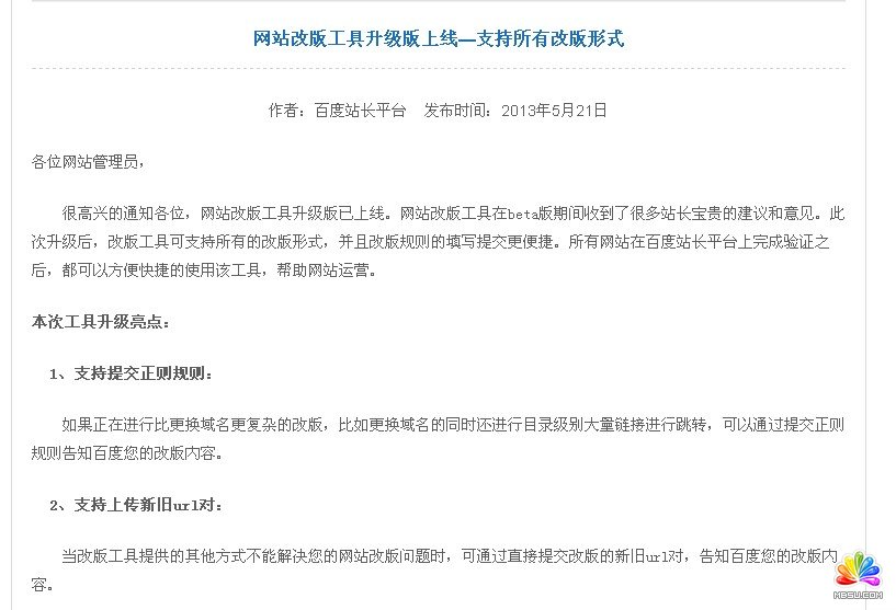 百度站長平臺2013-05-21發布了網站改版工具升級版上線,這或許對于很多穩定的站長來說也許是個煙霧彈,但是對于經常改版或者需要改版網站結構的站長來說就是福音,其實,對于這個新發布的改版工具升級版很多人不怎么會花時間去在意,但是我想說或許你現在作為一個資深或者新人站長來說,你不需要對網站的將來發展做出一些規劃嗎?或者換句話說,在SEO道路上,你必須在這個行業為自己找到一個長遠立足之道,這才是我們需要考慮的。所以我個人認為,不管是網站現在需不需要改版,我們都需要去了解去認識這個改版升級工具。