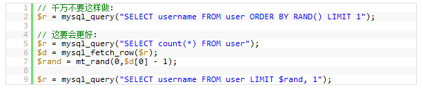 如果你真的想把返回的數據行打亂了,你有N種方法可以達到這個目的。這樣使用只讓你的數據庫的性能呈指數級的下降。這里的問題是:MySQL會不得不去執行RAND()函數(很耗CPU時間),而且這是為了每一行記錄去記行,然后再對其排序。就算是你用了Limit 1也無濟于事(因為要排序)