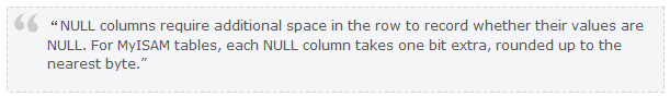 除非你有一個很特別的原因去使用NULL值,你應該總是讓你的字段保持NOT NULL。這看起來好像有點爭議,請往下看。