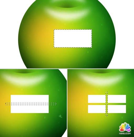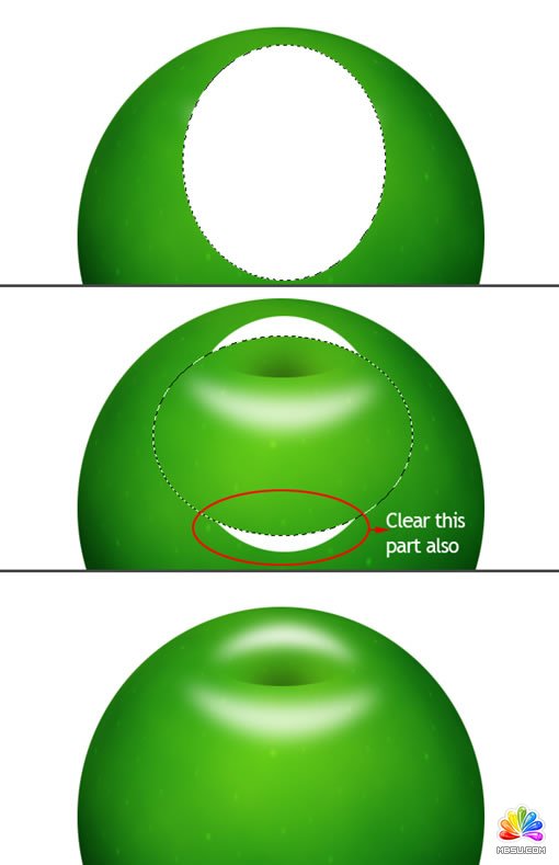 在最上面建立新層命名為”背景光“。CTRL+單擊”蘋果“層,將選區填充白色。在選區工具選中的狀態下用方向鍵將選區左移10像素。然后刪除。: x5 B& @: @ U1 S5 u% F