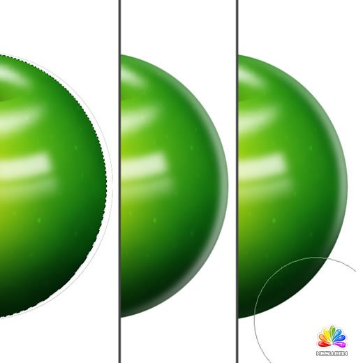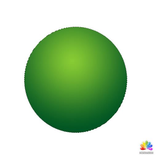 建立新層命名為“蘋果”,用橢圓選區工具,按如下圖形拖出選區。選擇漸變工具,選取由前景色到背景色的徑向漸變。前景色為:#88cc33,背景色:#005522,按如下方式填充選區。# n9 W1 c2 {1 M, d M9 L1 {