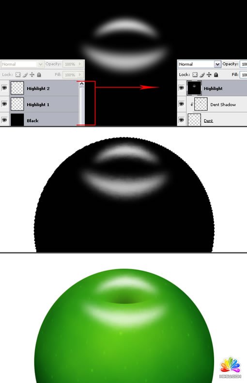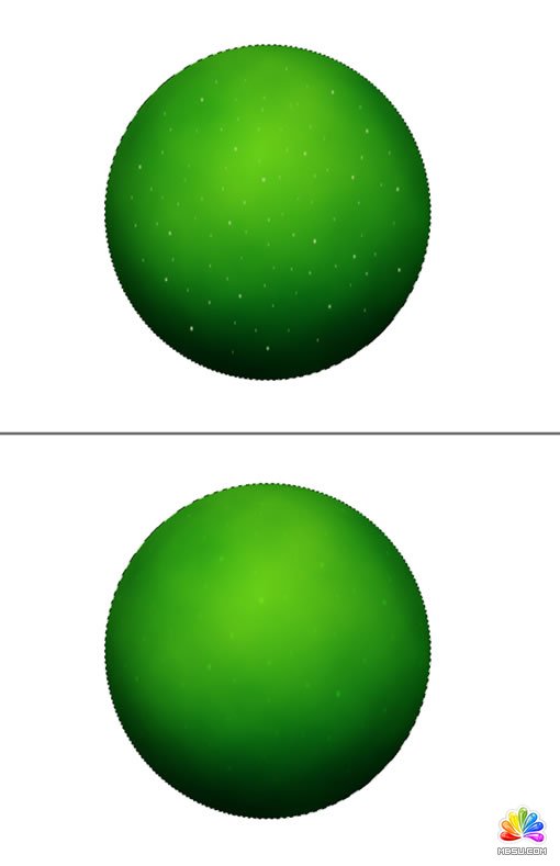 在”高光1“層下面建立新層命名為”黑色“。顧名思義,我們將填充為黑色。現在選擇”黑色“層,”高光1“層和”高光2“層,按下CTRL+E將他們合并。執行濾鏡》筆觸效果(Brush Strokes)》噴灑(Spatter)。噴灑半徑設置為6像素,平滑度為14。CTRL+單擊”蘋果“層載入選區,執行選擇》反選,按下DELETE刪除。層混合模式設置為濾色(SCREEN)。取消選區) |( ]$ T/ N: s$ W