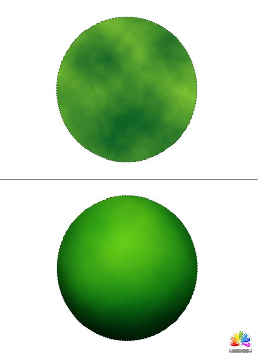 建立新層命名為“紋理”,CTRL+單擊“蘋果層”載入選區,應用第一步的顏色設置,執行濾鏡 》渲染 》 云彩,然后執行濾鏡 》扭曲(distort)》球面化,數量為100%,模式為正常。圖層混合模式設置為柔光。