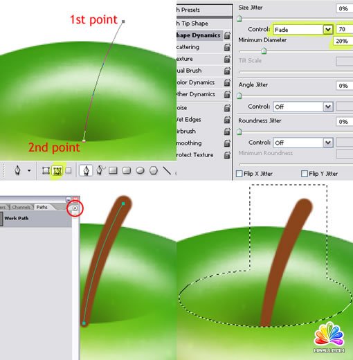 建立新層,命名為”柄“。選擇鋼筆工具,在選項里設置為路徑。為蘋果畫一個柄的曲線。現在選擇畫筆工具,打開畫筆面板。在圖形動態里,設置動態控制為尺寸到漸隱。設置為尺寸漸隱到70,最小畫筆直徑為20%。畫筆筆尖形狀下,直徑設置為14像素,硬度為100%。現在將前景色設為#884411。. O# Z4 F+ ^9 N+ P