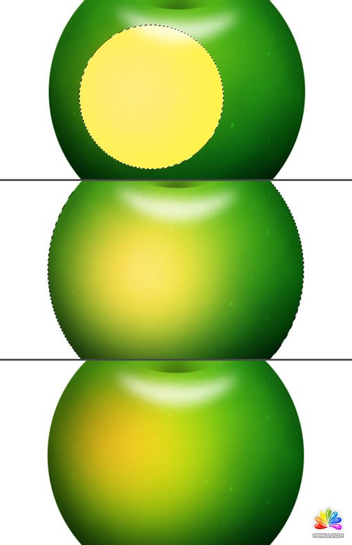 在”紅色“層下面建立新層命名為”黃色“。用橢圓選區工具建立選區,填充顏色#fff444,CTRL+單擊”蘋果“層載入選區。執行濾鏡》模糊》高斯模糊,應用50像素模糊。然后設置混合模式為”強光“,不不透明度為75%。CTRL+D取消選區。