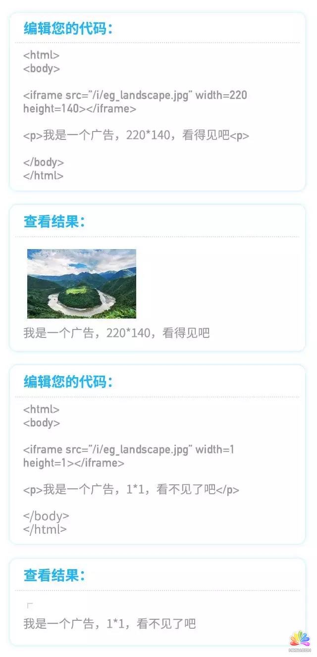 iframe是一個(gè)HTML標(biāo)簽,可以在當(dāng)前頁面中插入其他頁面的內(nèi)容,常常被用來作為承載展示廣告的載體。iframe有諸多屬性可以設(shè)置,其中最為廣告人喜愛的莫過于寬度width和高度height了。通過對(duì)這兩個(gè)參數(shù)的設(shè)置,可以將廣告尺寸從肉眼可見的220*140變成不可見的1*1。不就改了一個(gè)大小嘛,這算什么作弊呢?各位,大小改了之后,雖然你看不見,但檢測(cè)代碼看見了呀,這是一次正常的廣告展示,可以向廣告主收錢了。可見,作弊者對(duì)我們廣大用戶還是有一顆憐憫之心的:我就掙廣告主的錢,向借您一個(gè)像素點(diǎn),廣告不會(huì)顯出來,不影響您正常上網(wǎng)。這不正印證了那句老話嘛:“不打擾,是我的溫柔”。