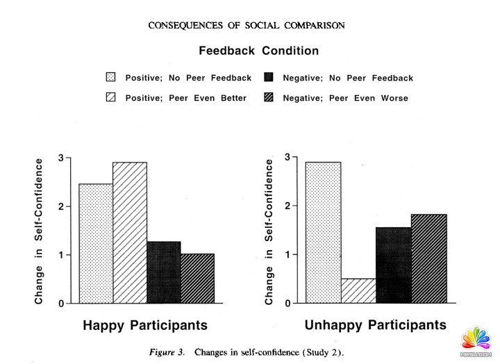 他們這項調查叫做“社會歡樂指數比較”,Sonja Lyubomirsky的合作伙伴和來自斯坦福大學的Lee Ross對開心與不開心的人做何種反應進行了實驗反饋。不管是在正面還是負面的活動中 ,快樂的積極參與者的自信心總是得到增強,不管他們是否對其他相同同齡人進行比較。