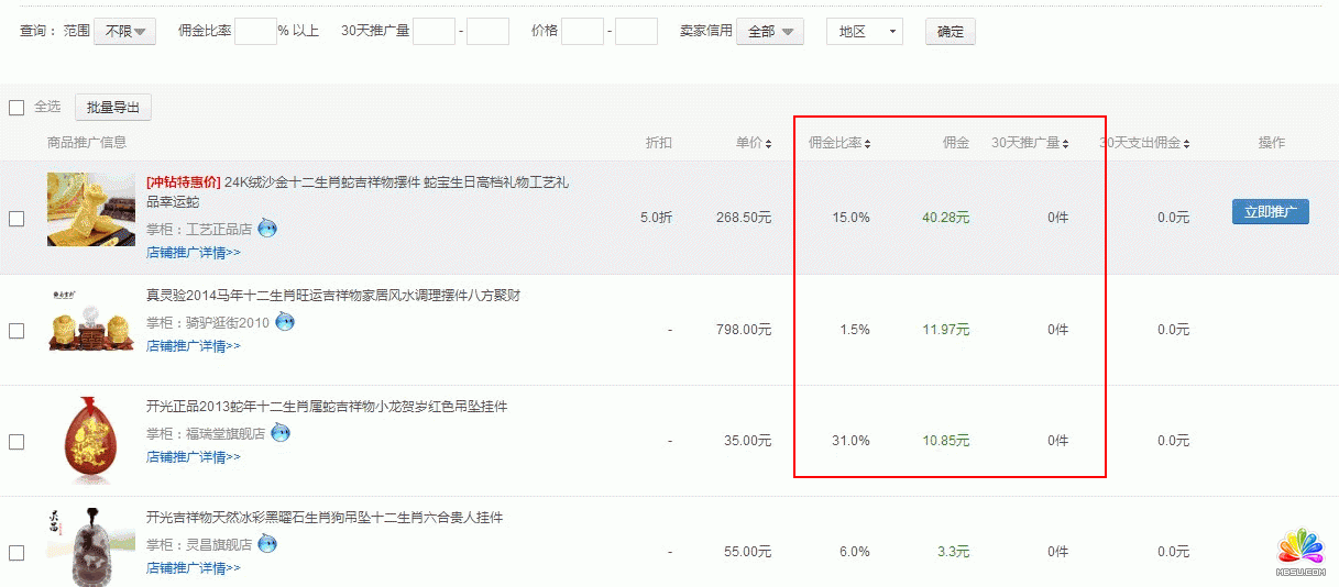 我直接搜索了傭金比例在20%以上的吉祥物,出現了如上圖所示的結果列表,我們看到有兩商家的傭金比列和單價特別高,一個268.5元的掛飾傭金在 40.28元,不過點進去一下發現銷量為0,而且是淘寶個人賣家,果斷pass。最后搜了一圈發現傭金比例在20%以上的飾品都不行,傭金高不代表銷量 好。試試證明,大多數傭金高的,他的成交量并不一定好。