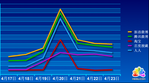 淘寶,作為國內最大的b2c網站,每一次大型活動都會引起分享數據的大幅度波動。新風尚活動專題,作為淘寶商城更名以來的第一次大的促銷及天貓新品牌的宣傳活動,對分享數據的影響當然也不例外,而且在其影響下,分享到新浪微博、騰訊微博、人人、百度搜藏的數據也都呈現了異于平時的畸形增長,如圖: