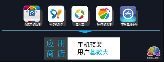 首先就是應(yīng)用商品,百度手機(jī)、21手機(jī)助手、應(yīng)用寶、360等,目前國(guó)內(nèi)的產(chǎn)品也都有各自的優(yōu)勢(shì)。例如華為、vivo,業(yè)務(wù)市場(chǎng)的收入就是硬件收費(fèi)這一塊。因?yàn)閼?yīng)用商品是手機(jī)預(yù)裝的,而且不可卸載,所以他的用戶基數(shù)非常大。如果需要要推廣APP,首先會(huì)進(jìn)入到用戶商品里,它的特點(diǎn)就是用戶量大,但是他們用戶帶來的量是有限的,是比較單一的。