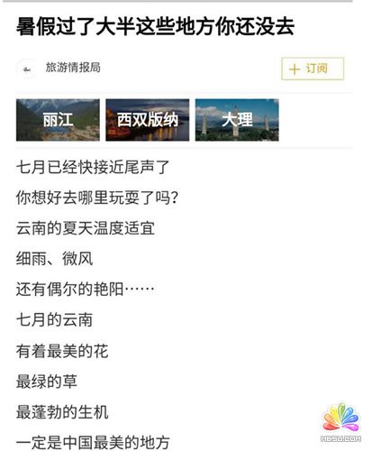 就已飛豬旅行這篇文章為例,通過優美景色的描述加上實地拍攝的景色圖片,來進行旅行的宣傳。看標題,“暑假過了大半”,讓讀者明白,現在還有時間,去旅行還來得急;“這些地方你還沒去”給讀者列舉出當下適合旅行,平常又沒時間去的地方,在暑假這個階段正適合。