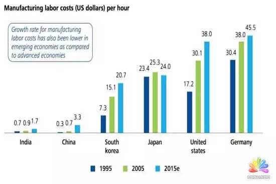 下圖是制造業(yè)人力成本比較。中國成長很快,但與發(fā)達國家相比還是很有優(yōu)勢。