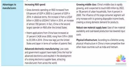 還是做個聲明:德勤的報告很全面。我側重挑的是“正能量”部分。這是因為講問題的部分(如環(huán)境保護、專利、法律等)大家太耳熟能詳了,已經(jīng)成了網(wǎng)絡聲音的主流,甚至很多都是幸災樂禍而已。中國制造業(yè)的全貌反而被這些偏見聲音所掩蓋。所以大家有必要看到不同的聲音。 我后面如果提供數(shù)據(jù)也會秉承這樣的“偏見”,需要大家自己做綜合的全面思考。