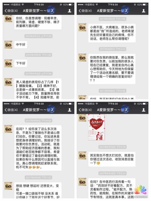 但是我對他還抱有一絲希望,所以我忍了兩天,正打算聯(lián)系他咨詢一下產(chǎn)品,沒想到我的小號消息快爆炸了,這老中醫(yī)給我發(fā)了很多消息,這些消息我一看就知道是提前寫好的“話術(shù)”,而且既然你那么牛逼,為什么有那么多的時間來主動找我?